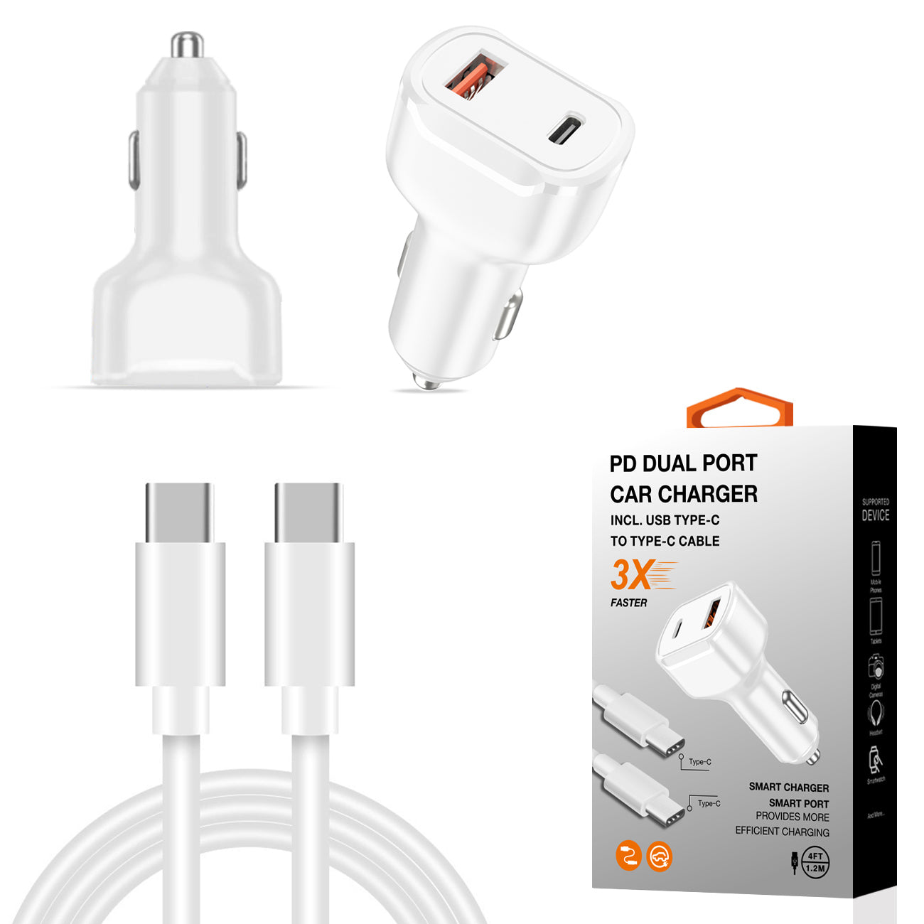 - 1 Car charger plug, 1x 4ft type-c to type-c cable are included in the bundle.
