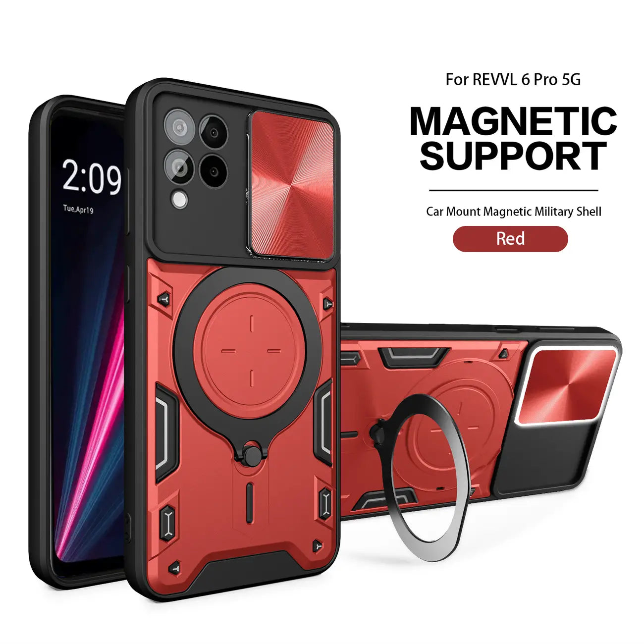 / TPU PC Shockproof Magnetic Phone Case with Free Adjustment Ring Holder for REVVL 6 PRO 5G in Red
